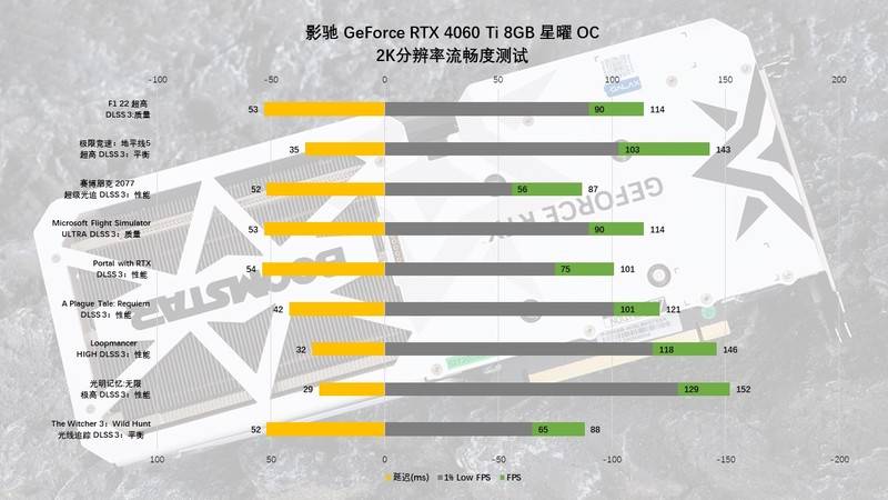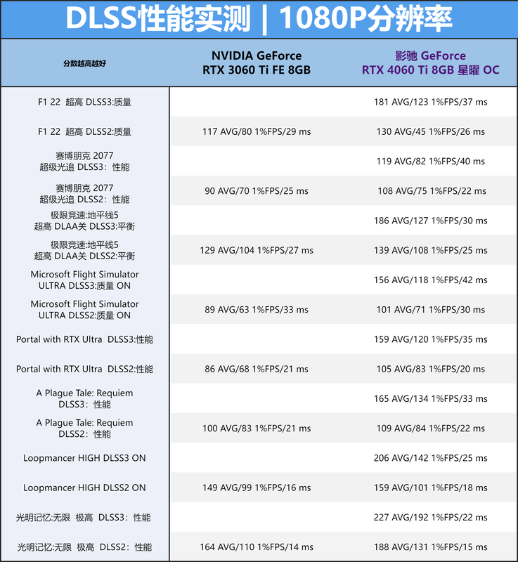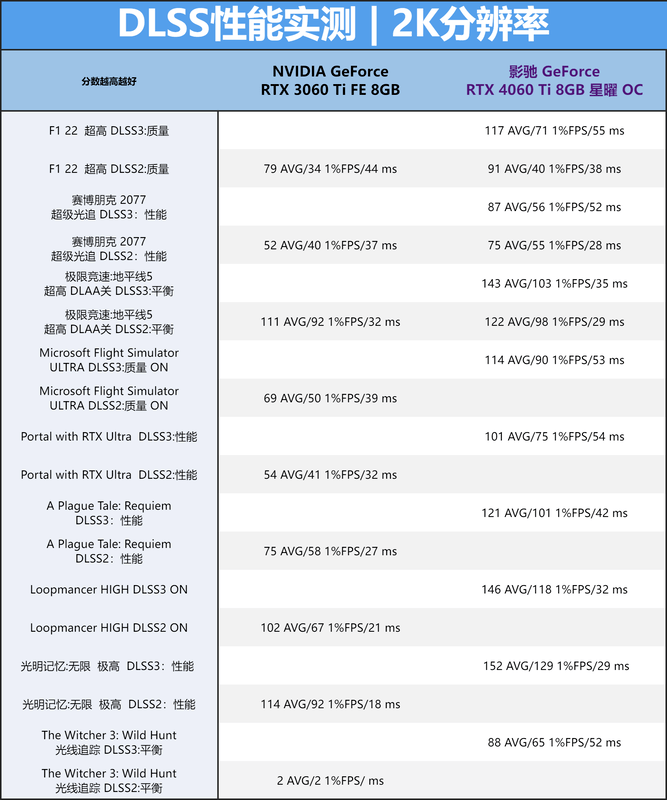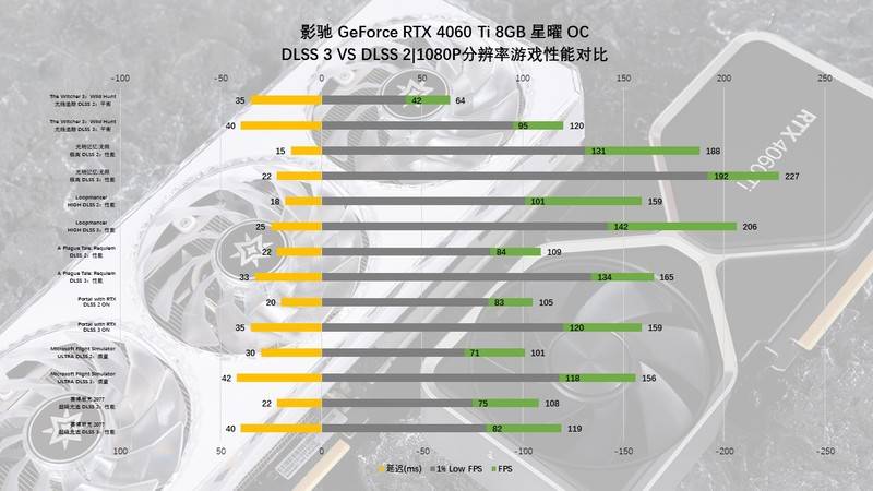 并且影驰RTX 4060 Ti 8G星曜OC相比起RTX 3060 Ti更是优越,有了DLSS 3加成后,对比前者只能开DLSS 2,完全是降维打击,不少游戏的帧数直接就相差了40帧之多,甚至于开启DLSS 3后,影驰RTX 4060 Ti 8G星曜OC在游戏中的1% Low FPS比RTX 3060 Ti的平均帧都要高出不少,游戏体验是质的飞跃。