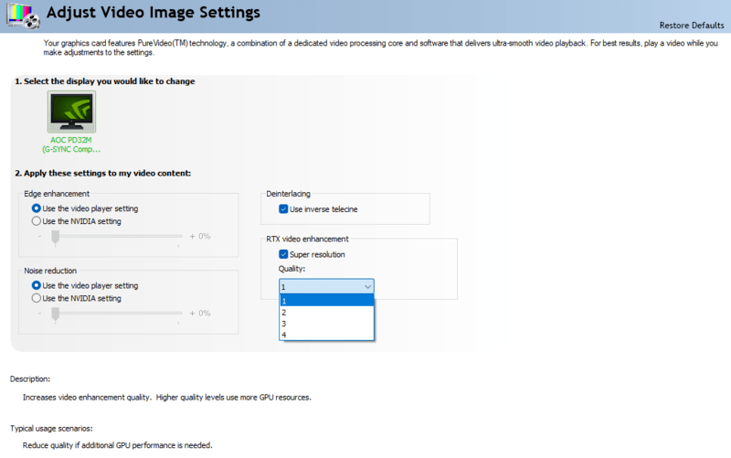 今天我们也用影驰RTX 4060 Ti 8G星曜OC测试这项划时代的RTX VSR技术。使用相当简单,在RTX 30系和RTX 40系的NVIDIA控制面板中找到视频图像设置,手动开启RTX Video enhancement即可启用RTX VSR技术,其中分为1-4档调节,数字越大质量越好。