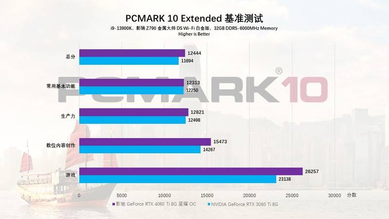 先看看PCMark10 Extended项目上各显卡的性能表现如何,可以看到影驰RTX 4060 Ti 8G 星曜OC在游戏这个子项目上与前代的RTX 3060 Ti拉开了差距,并且领先幅度约为15%左右,这与我们上面的游戏实测相符。
