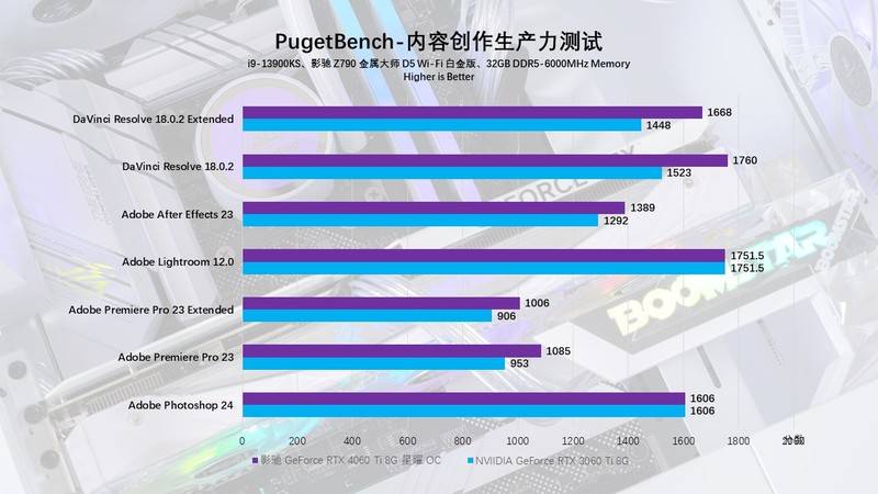 实测环节同样如此,在PugetBench中,影驰RTX 4060 Ti 8G 星曜OC不单止超越了前代的RTX 3060 Ti,甚至在支持AV1编码的达芬奇软件中优势进一步拉大,有了AV1的加持后,影驰RTX 4060 Ti 8G 星曜OC相比RTX 3060 Ti足足领先了15%的性能,这是前代显卡无论如何也无法逾越的一道鸿沟,毕竟这需要RTX 40系显卡中的双NVIDIA编码器的硬件支持。