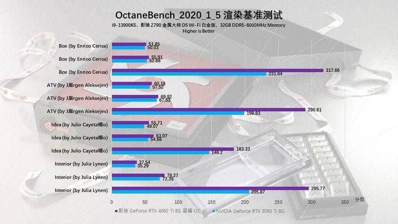 如果换作是OC渲染器,优势更加明显,性能足足是RTX 3060 Ti的1.2倍!这明显是ADA架构革新所带来的算力提升。想要提升专业性能的用户不妨考虑一下影驰RTX 4060 Ti 8G 星曜OC,极具性价比的售价带来前所未有的强悍性能表现,不得不说真香!
