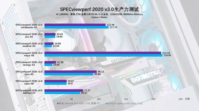 画面一转,我们看看工业软件的表现如何,在N卡常用的Blender和V-Ray渲染软件中,影驰RTX 4060 Ti 8G 星曜OC相比RTX 3060 Ti分别有40%和20%的性能提升,表现出色,RTX 40系的性能果然不让人失望。