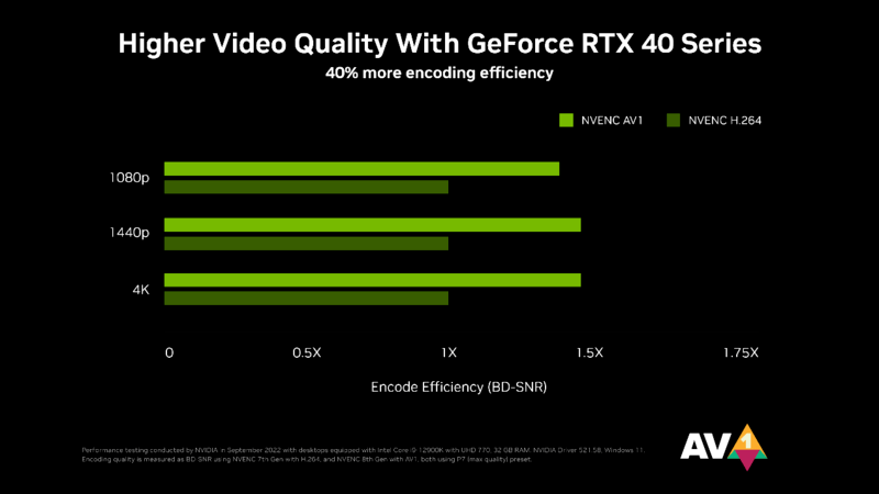 RTX 40系显卡还有一项黑科技可以帮助你提升创作性能,影驰RTX 4060 Ti 8G星曜OC内置了NVIDIA编码器,它支持时下热门的AV1编码,作为下一代主流的视频编码技术有着自己独特的优势,更快的编码速度和更高质量的流媒体传输性能,让越来越多的剪辑软件和视频网站青睐于它,像我们熟悉的达芬奇、剪映、B站等已经支持AV1编解码,未来AV1将会成为一个新趋势。