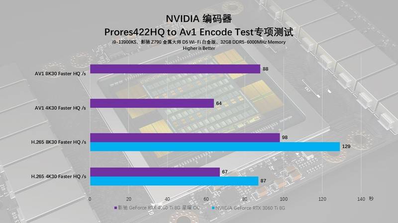 我们使用NVIDIA提供的8K片源与工程文件分别测试AV1格式和H.265格式下的编码时间。实测同一段素材下,同样使用H.265编码,有双编码器的加持下,影驰RTX 4060 Ti 8G星曜OC的效率比RTX 3060 Ti快25%以上,如果使用AV1编码,那效率会比H.265快30%左右。