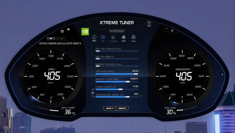 这里我们使用影驰官方提供的XTREME TUNER魔盘工具对显卡进行超频,这款工具不仅可以解锁GPU核心的电压限制、功耗限制等,还可以自由调节风扇转速,实测这款显卡的散热配置明显是超规格的,因此风扇转速还可以进一步下探,超低的风扇噪音还你舒适的使用体验。
