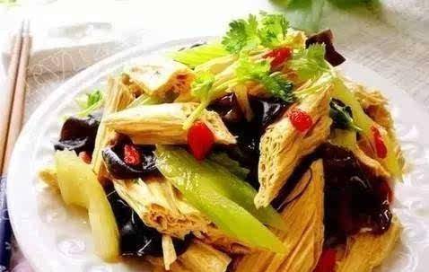 — 口感美妙的美食选择:山药甜汤、木耳腐竹、西红柿炒海鲜菇和蒜炒黄豆芽 —