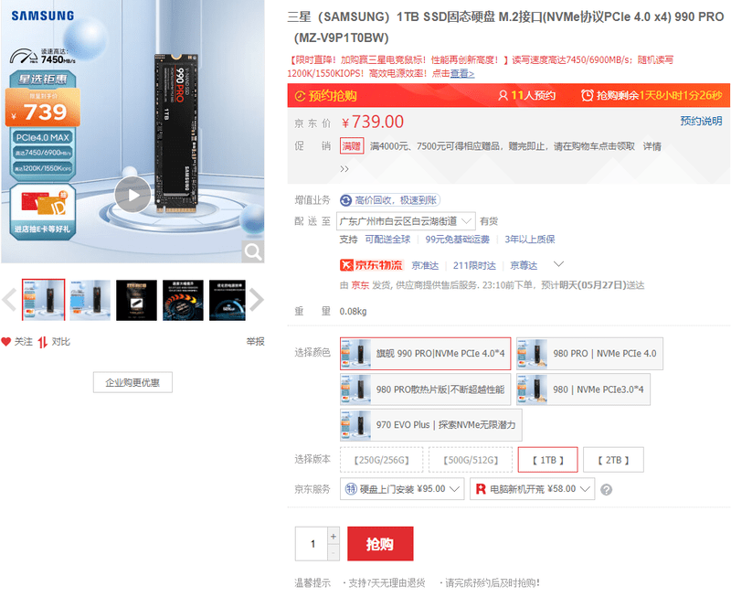 三星990pro固态1t游戏m2 ssd硬盘【优惠券:满689元减10元】
