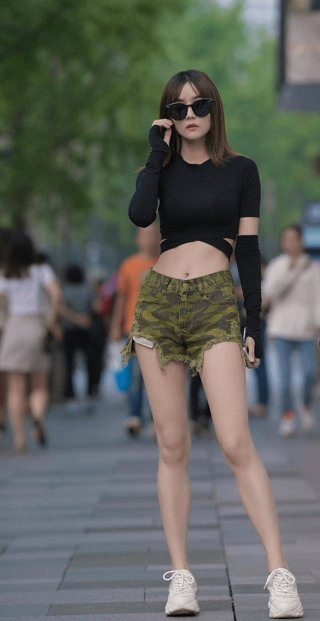 — 个性十足:迷彩短裤搭配露腰款式,凸显时尚年轻态度 —