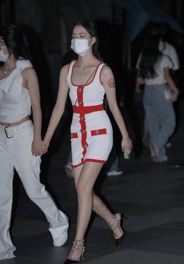 — 展现女性魅力的红白拼接针织无袖连衣裙,搭配白色链条小包 —