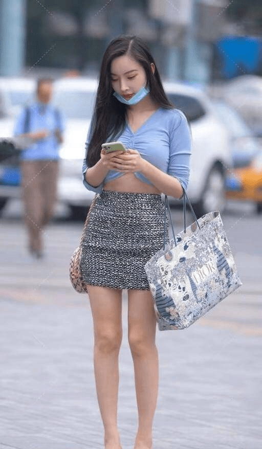 — 时尚搭配:蓝色褶皱T恤+银色亮面包臀裙,彰显苗条体态,深受年轻女孩喜爱 —