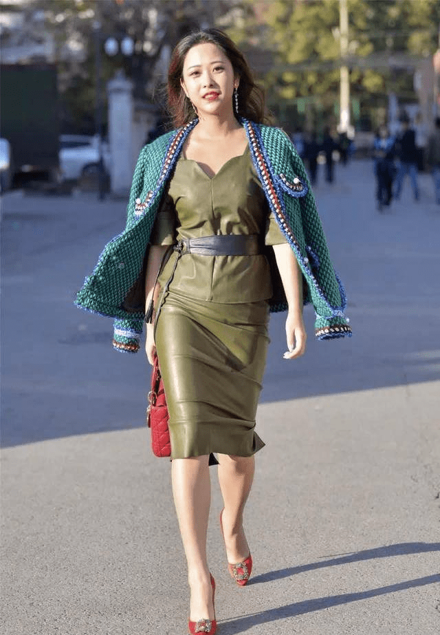 — 改为:“绿色皮背心+皮裙,搭配红色尖头高跟鞋,非常时尚” —