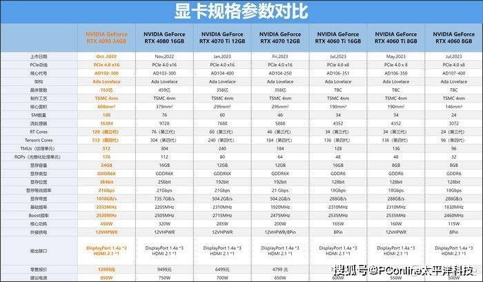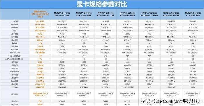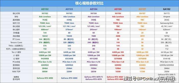 大家带着几个关键字来看上面的【显卡规格参数对比】表格,就可以更容易读懂上述表格了。最新一代的桌面显卡GeForce RTX 40系列均采用全新的Ada Lovelace架构核心, GeForce RTX 4090的核心是 AD102,目前Ada Lovelace架构核心中最为强大的,具有760亿个晶体管、16384个CUDA核心和24 GB高速美光GDDR6X显存。