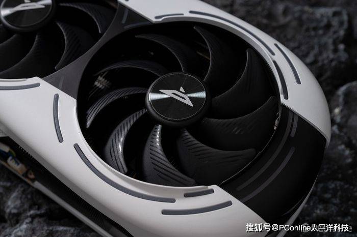 每把风扇的扇叶也有小设计,仔细看可以看到每一片扇叶上都有鳞状仿生条纹,官方称其为盾鳞2.0高压扇叶,扇叶的曲率也有改善,这些小改动可以提高风扇的进风量、风压与风流,让冷空气吹透整个散热鳍片,帮助显卡快速降温。