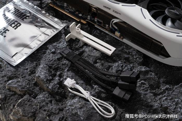 因此为了应对这个重量级的显卡,索泰也在包装盒内附赠了全金属的显卡支架,既美观又能杜绝显卡变形,给予显卡有效保护。少不了的还有电源转接线与RGB线,甚至连说明书都专门做了收纳,细节拉满。