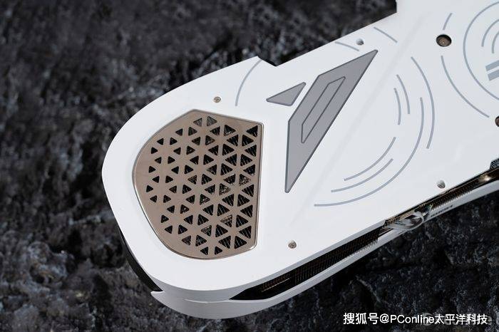视角回到显卡身上,整张显卡以白色为主打色,中间有黑色的缎带贯穿始终,不过与黑色的风扇恰如其分,黑白撞色设计在视觉效果上既时尚前卫,又带来了一种沉静之感与中和之意,静谧而平衡,同时也暗藏了一丝丝电竞硬核风格,设计相当超前。