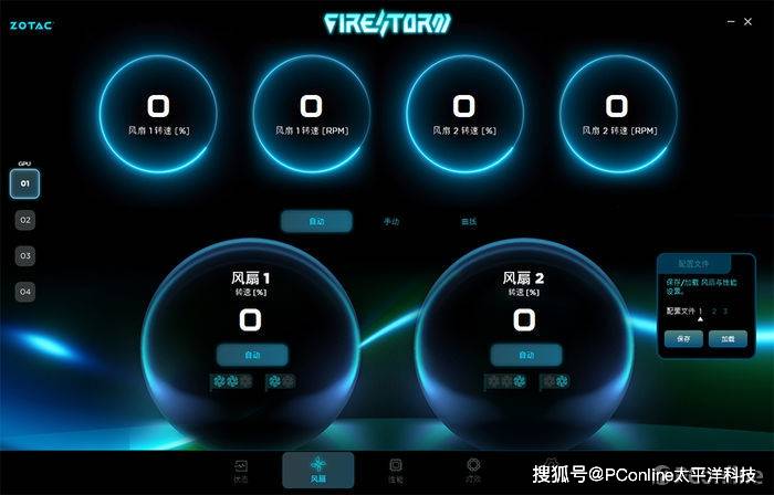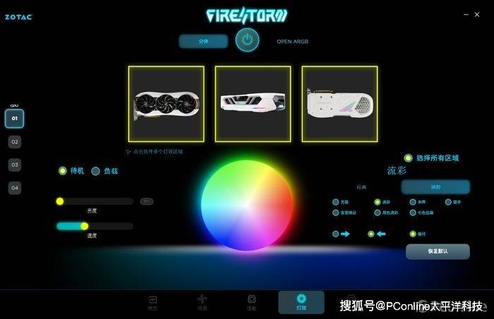 玩灯那总要可以自定义吧,索泰的FireStorm软件就集成了这个功能,玩家可以用它自定义RGB,在电源接口的旁边还有OPEN ARGB接口,通过附赠的线即可实现整机灯效同步,实现千变万化的灯效设计,打造专属于你的靓丽显卡。