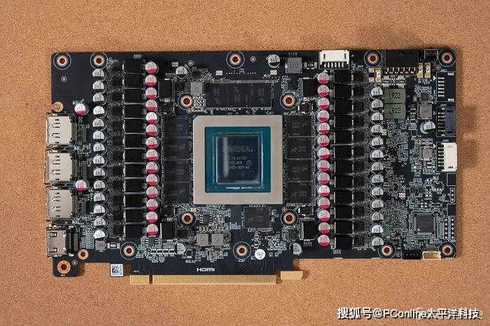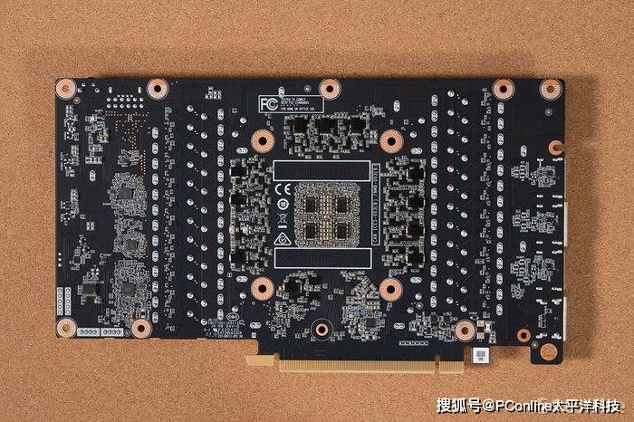 整张显卡的PCB板就突出“高级”二字,黑色的色调加上合理规整的设计,一眼就能看出它出自大厂之手。正面是各式各样的供电芯片、电感、核心以及显存,密密麻麻铺满了整个PCB板。