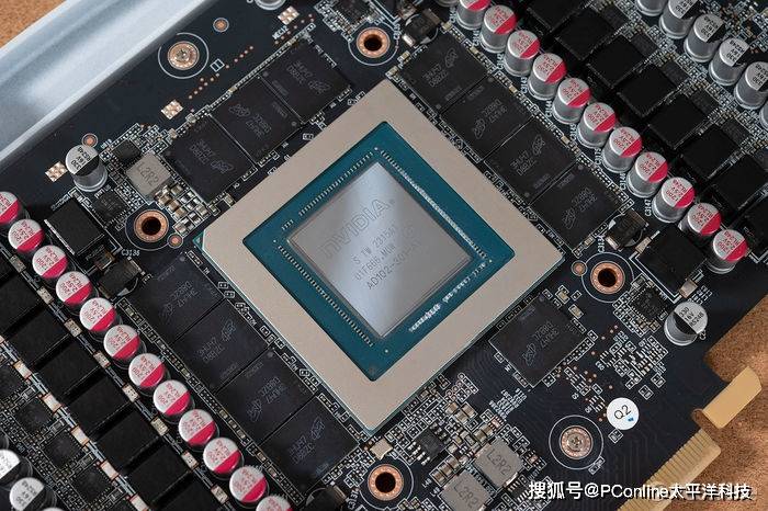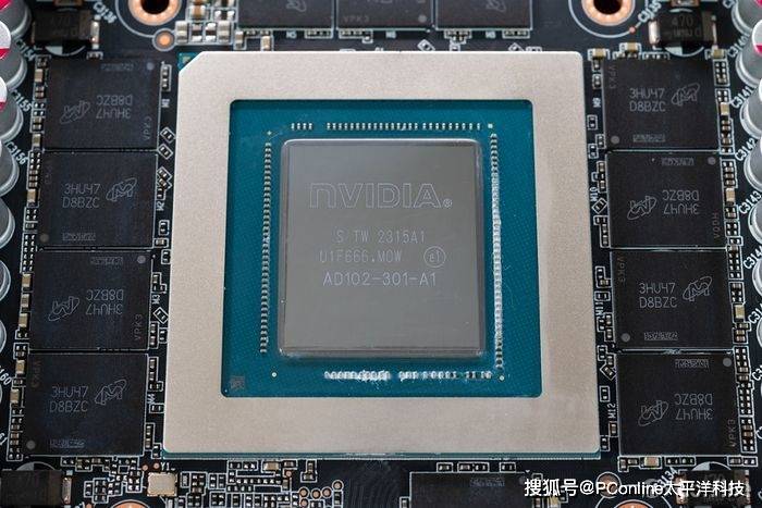 终于轮到我们的主角了,这颗AD102-301-A1核心四平八稳的镶嵌在PCB的正中央。你以为它只是小小的一颗芯片,其实它得益于TSMC 4N工艺,在里面塞下了763亿个晶体管,这个数量足足是RTX 3090 Ti的2.7倍!