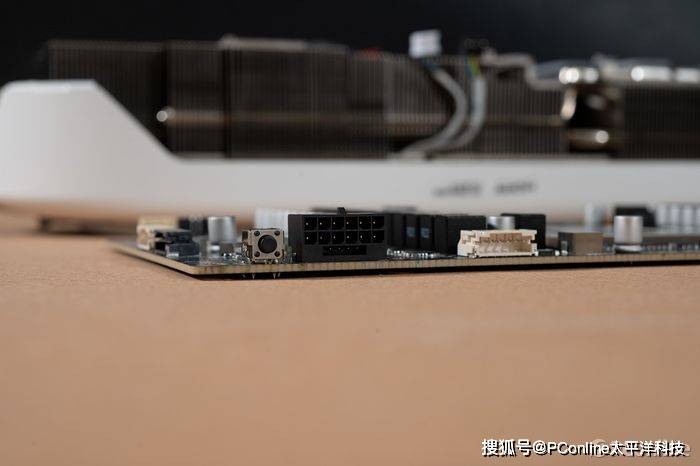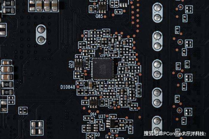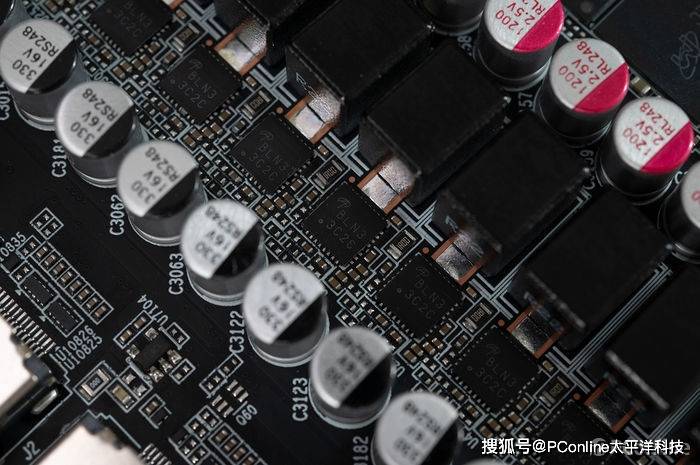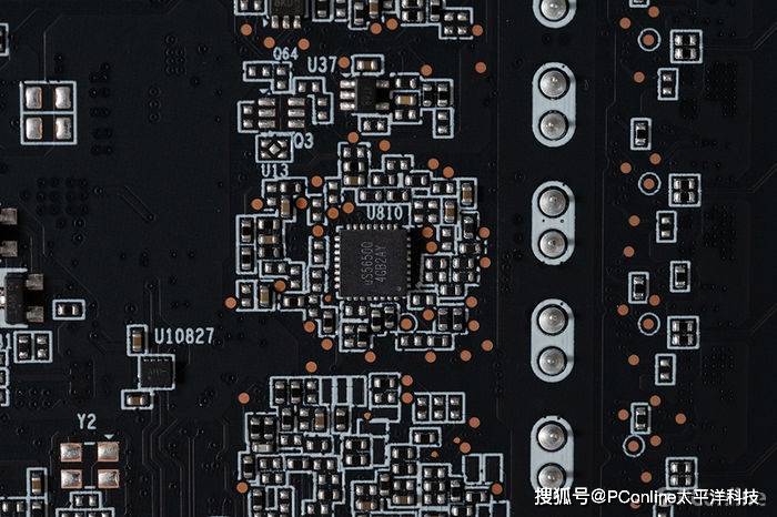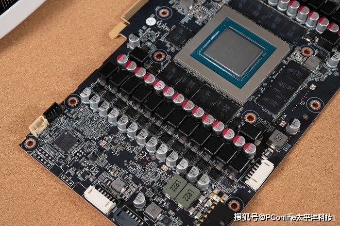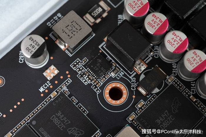 俯瞰整张PCB,你就可以发现,它的供电规模也堪称豪华,采用了SEP 2.0供电系统。供电总相数来到了夸张的28相,其中24相为核心供电,4相为显存供电,并且供电集成度相高,每相均采用了固态电容做输入输出,还有全封闭电感坐镇。