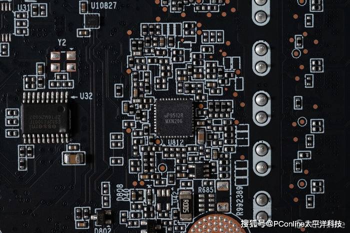 PWM主控则位于PCB的背部,型号分别是:uP9512R、uP9512U以及uS5650Q。其中uP9512R与uP9512U共同管理核心供电,可以做精细化的供电管理。