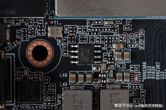 当然,上面提及芯片,PCB上还有众多不可或缺的芯片,例如在核心周围还能看到两颗BIOS控制芯片,型号为IS25WP016,分别控制这款显卡的默认BIOS与极速BIOS。