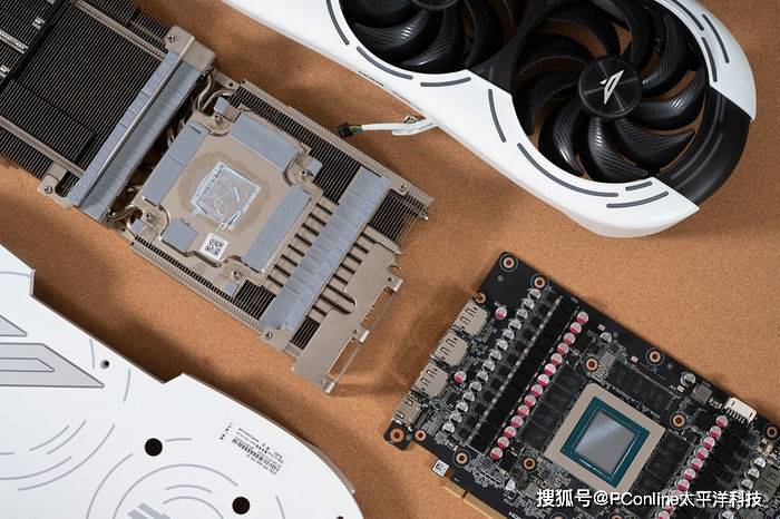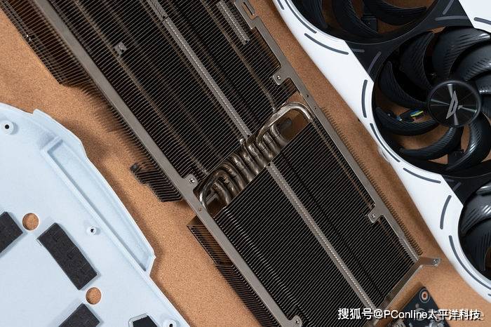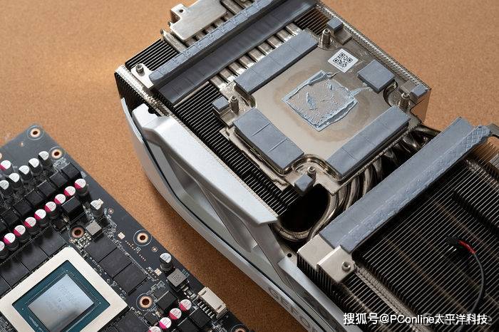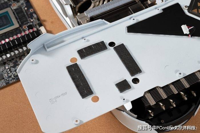 在VC均热板的四周是一片又一片定制的高K导热垫,它们覆盖了显存、电感、MOS感等发热大户,让其与散热模组之间无缝连接,散热的同时还能减少啸叫几率。中间的核心区域则是厚厚的硅脂,给核心专供,如此高规格的配置,为的就是让这款顶级显卡能够全力释放性能。