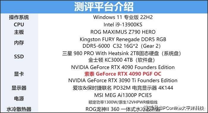 索泰RTX 4090 PGF OC的里里外外大家都见证过了,下面就该真刀真枪的上机测试了。还是编辑部的天花板配置,CPU用的是最新的Intel Core i9-13900KS,华硕的Z790 Hero主板搭配2根16GB的金士顿DDR5-6000高频内存。