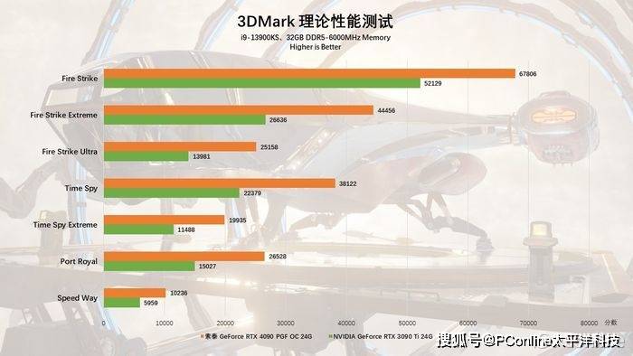 先看看索泰RTX 4090 PGF OC的基准性能吧,这里选用3DMark作为测试工具,从测试结果中可以看出,索泰RTX 4090 PGF OC对RTX 3090 Ti就是碾压,在DX 11为基准的Fire Strike系列测试中,67806的超高成绩比后者高出仅1W多分,性能提升幅度达到了近20%,而在DX 12为基准的Time Spy中,38122的超高分数同样强过RTX 3090 Ti的22379分。
