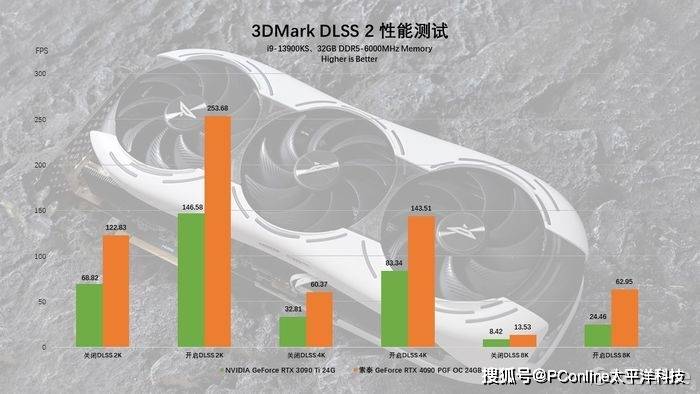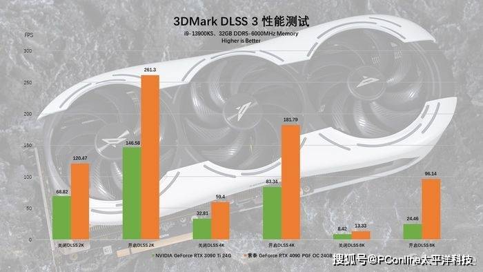 不过要说提升最大的就得属光追与老黄引以为傲的DLSS了,在Port Royal测试中,索泰RTX 4090 PGF OC领先RTX 3090 Ti就有23%以上!而在DLSS方面,这张显卡的提升堪称恐怖,2K下开关DLSS可以有超百帧的差距,更离谱的是8K下,仅开启DLSS 2也能做到60 FPS流畅运行。
