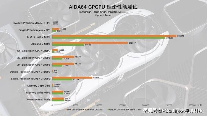 而在其他理论性能测试中,索泰RTX 4090 PGF OC更是王者风范,例如在GPGPU理论中,拥有Ada Lovalace架构的RTX 40系列显卡在算力上也有出色的性能表现,尤其是单精度和双精度浮点运算上,提升幅度是最大的。索泰RTX 4090 PGF OC整体性能相比RTX 3090 Ti的性能提升足足有92%左右,不少项目更是2倍甚至3倍的飞跃,着实让笔者越测越兴奋。
