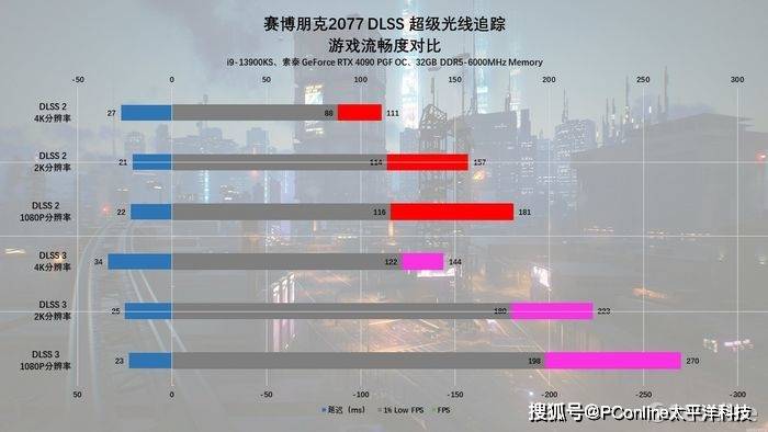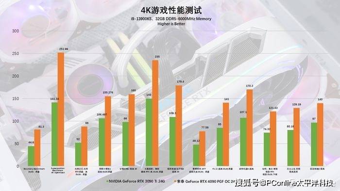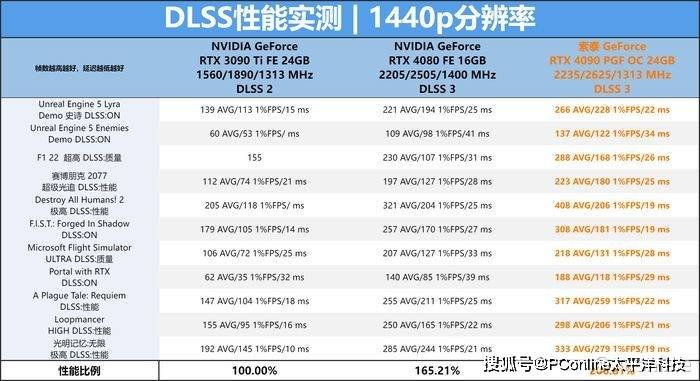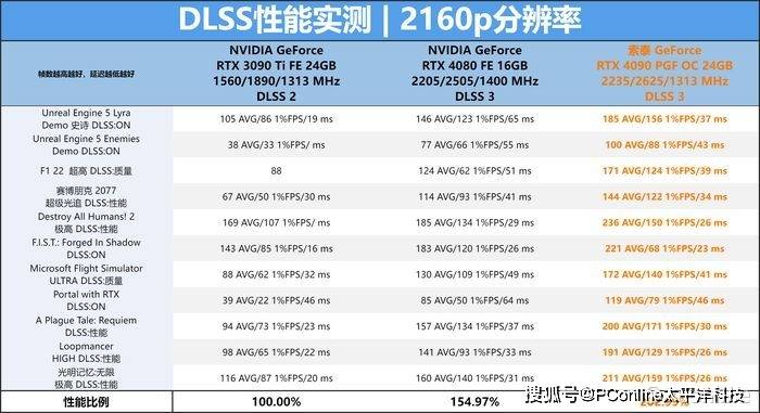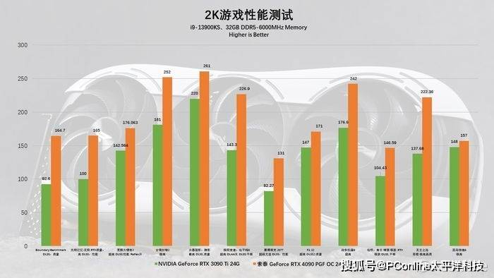 首先是2K分辨率下,开启DLSS 2的索泰RTX 4090 PGF OC相比起前代卡皇已经大幅领先了,一旦开启了DLSS 3,这张显卡仿佛脱缰的野马!2K下不少游戏有了300+的帧数表现,看来还是太小看这张索泰RTX 4090 PGF OC了,4K甚至8K才是它的战场。