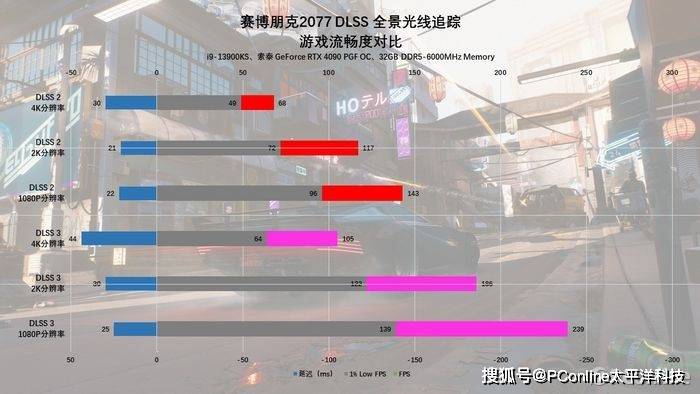 还是老样子,先验一下DLSS 3的实际理论性能,实测下来有DLSS 3的加持下,索泰RTX 4090 PGF OC显卡相比RTX 3090 Ti实现了性能的翻倍,在4K分辨率下,不开DLSS 3仅能勉强维持在60 FPS附近,一旦开启DLSS 3后,性能直接提升三倍,180+FPS的惊人表现直接超出RTX 3090 Ti 100多FPS。