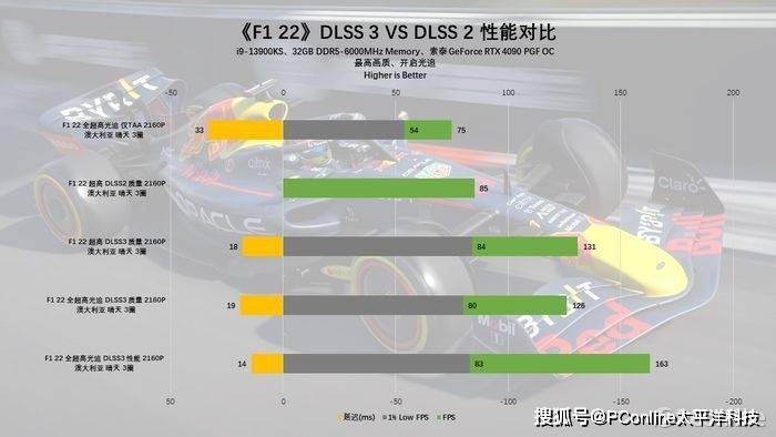 让我们再看看另一款支持DLSS 3的游戏《F1 22》,索泰RTX 4090 PGF OC依旧强势,在4K画质下开启全高特效,有了DLSS 3的加成,索泰RTX 4090 PGF OC能够跑到163帧,若只使用DLSS 2,则帧数只有85帧左右,相当于DLSS 3这个黑科技给游戏带来了50%的游戏性能提升,相当不错。