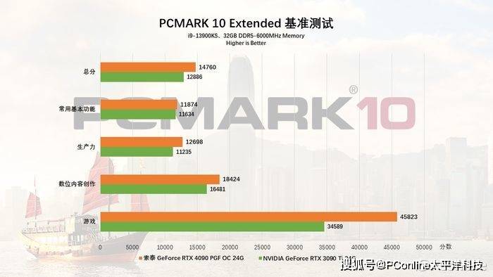 首先是PCMark 10 Extended项目,索泰RTX 4090 PGF OC显卡在每个项目上都完成了超越,整体性能领先前代的RTX 3090 Ti达到了15%左右,不过根据我们前面的测试,领先幅度远不止于此,毕竟单是游戏中就是几十上百帧的差距。