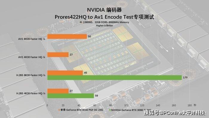 先看看大家关心的速度,我们选用NVIDIA提供的样片进行导出测试,有第八代NVENC双编码器加持的索泰RTX 4090 PGF OC确实能带来更好的性能表现,同样是H.265视频输出,它的效率就要比上代显卡快多了;若你是输出8K30的视频,这张天花板级别的RTX 4090只需要46秒就能完成了,相比之下隔壁的RTX 3090 Ti却要170秒,几乎是4倍的效率提升!