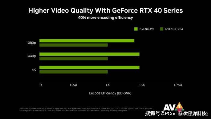 GeForce RTX 40 系列显卡还有一个全新的升级,那就是双编码器NVENC。第八代的NVENC双编码器不仅支持H.264与H.265,还支持开放式视频编码格式 AV1。