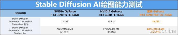 要说测AI又怎么能够少得了生成式AI中最经典的Stable Diffusion AI画图呢,拥有24GB超大显存的索泰RTX 4090 PGF OC显卡可以说是这里的最强王者!选择NVIDIA提供的描述,生成50张768 x 768的图片,索泰RTX 4090 PGF OC以1分钟19张图的速度一骑绝尘,作为对比,上代的RTX 3090 Ti则是一分钟11张图,可见架构革新确实能够带来不小的性能提升,换用新的RTX 40系显卡也能让你在AI时代乘风破浪。
