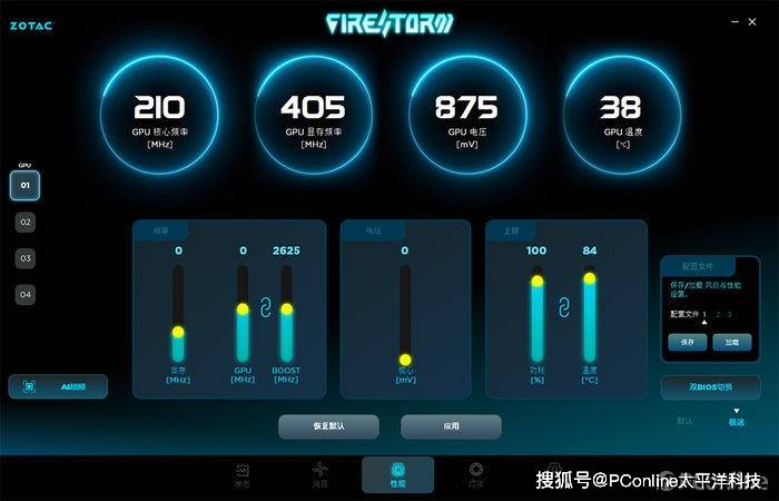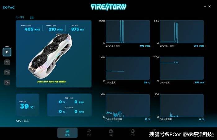 可以解锁功耗的RTX 4090,那怎么能少得了超频呢,索泰RTX 4090 PGF OC显卡,无论是散热配置还是性能释放,都是顶级中的顶级。这里我们将使用索泰的FireStorm控制中心对显卡进行超频,这款软件不仅能够用于超频,还能轻松控制显卡BIOS、灯效调节、查看显卡状态等。