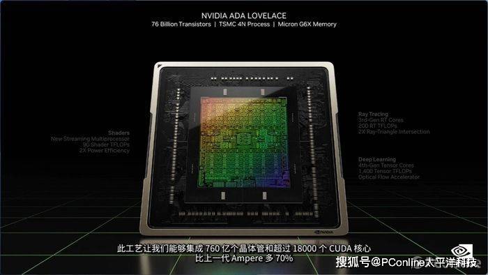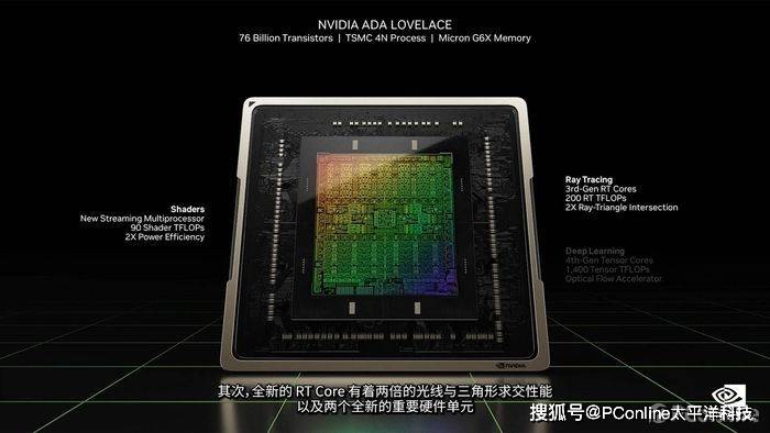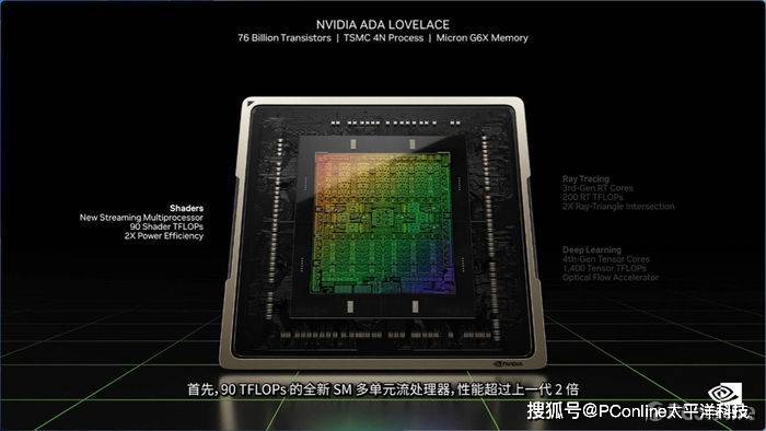 在讲述核心架构前,我们先了解几个关键词:GeForce RTX 4090、Ada Lovelace、TSMC 4N、608mm²、760亿个晶体管、2倍性能功耗比。