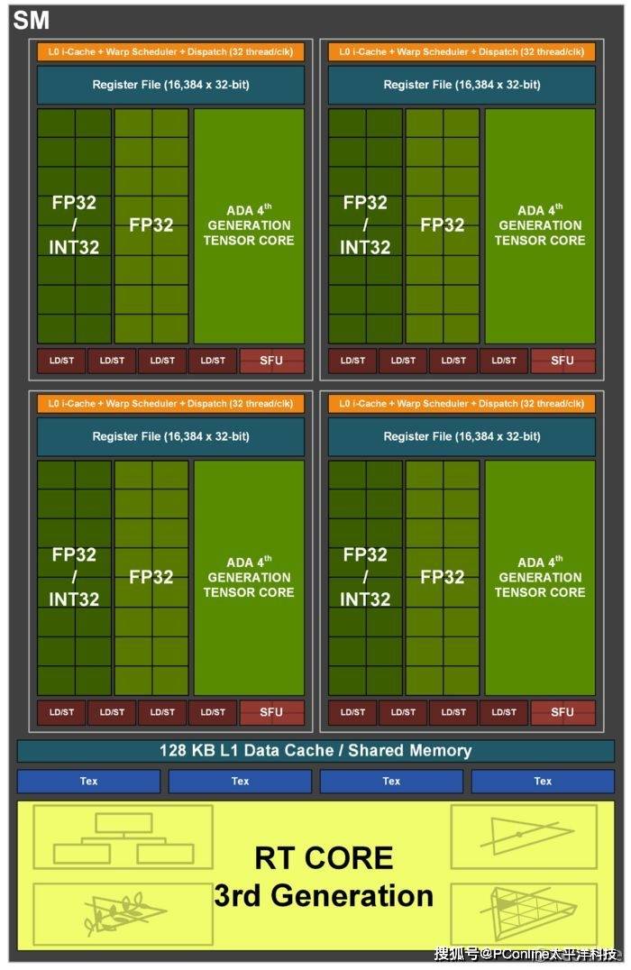 Ada Lovelace架构中最大的亮点之一:全新的SM流式多处理器,每个SM包含了128个CUDA核心、1个第三代的RT Cores,4个第四代 Tensor Cores(张量核心)、4个Texture Units(纹理单元)、256 KB Register File(寄存器堆),以及128 KB L1 数据缓存/共享内存子系统,于是这一个全新的SM单元有着超过上一代2倍之的性能表现。
