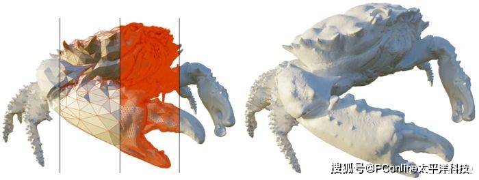 通过NVIDIA给出的创建14:1珊瑚蟹例子来说事,这里我们需要需要1.7万个微网格、160万个微三角形,在Ada Lovelace架构中BVH创建速度可加快7.6倍,存储空间缩小8.1倍。Displaced Micro-Meshes Engine起到了关键性的作用,其将一个几何物体根据不同细节分成密度不一的微网络处理,红色密度超高,细节处理越为复杂 。相应的低密度微网络区域则可以释放更多的资源与存储空间,这样Displaced Micro-Meshes Engine就可以帮助BVH加速过程,减少构建时间和存储成本。