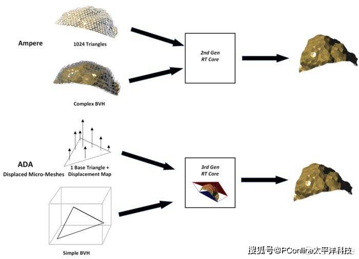 如果说Opacity Micromap Engine加速的是面处理,那么Displaced Micro-Meshes Engine就是几何曲面细节的加速器。如上图所示,在Ada Lovelace架构中,通过1个基底三角形+位移地图,就可以创建出一个高度详细的几何网格,所需要资源占用比二代RT Cores更低,效率也更高。