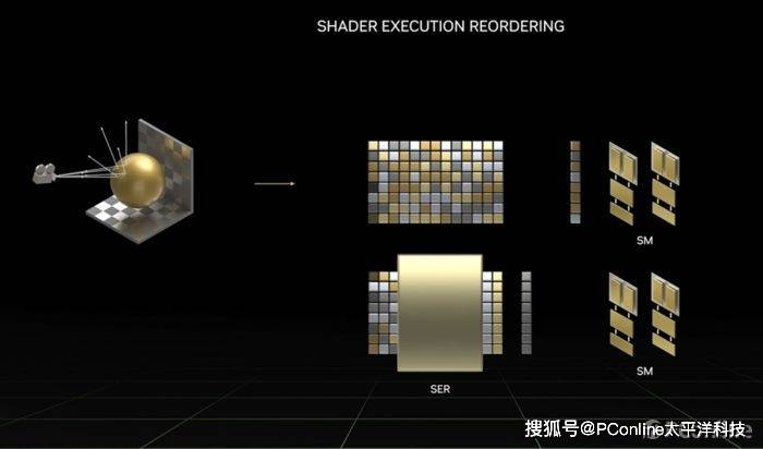 同时Ada Lovelace架构SM中新增了着色器执行重排序(Shader Execution Reordering,SER),这是由于光线追踪不再只有强光或者阴影渲染处理,未来将会更多的是在光线的运动性,这样光线就会变得越来越复杂,想要第三代 RT Cores与第四代 Tensor Cores有着更高的执行效率,那就得为他们来安排一位管家。而着色器执行重排序(SER)就是为了能够即时重新安排着色器负载来提高执行效率,为光线追踪提供2倍的加速,也能更好地利用 GPU 资源。不过目前仍未有实例,想实现这个功能,还得游戏与开发工具的支持才行。