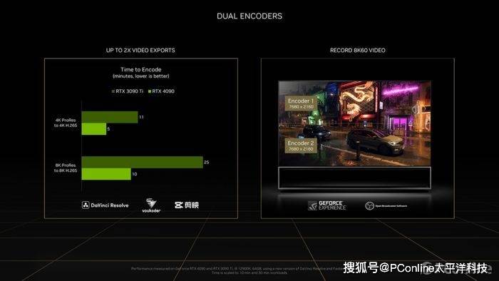 上面我们也提到了RTX 40系列还藏有一项黑科技可以加速你的视频内容创作,其实就是它的第八代NVIDIA双编码器,它支持时下热门的AV1编码,作为下一代主流的视频编码技术有着自己独特的优势,更快的编码速度和更高质量的流媒体传输性能,让越来越多的剪辑软件和视频网站青睐于它,像我们熟悉的达芬奇、剪映、B站等已经支持AV1编解码,未来AV1将会成为一个新趋势。