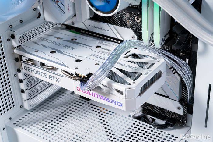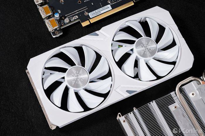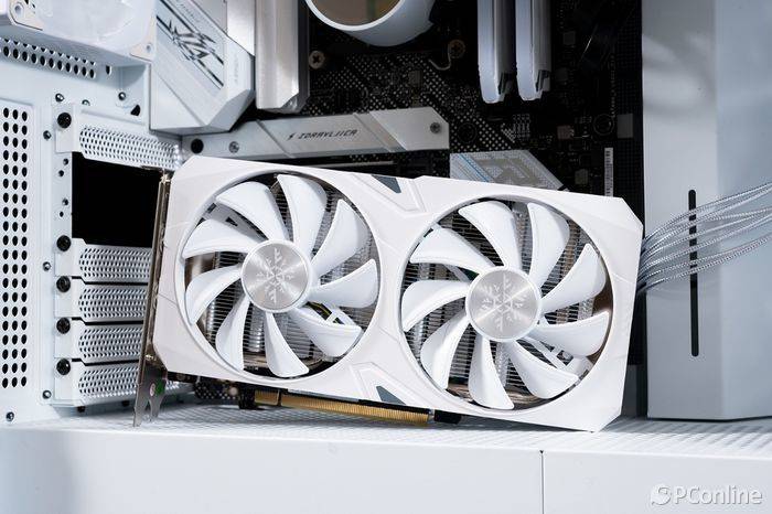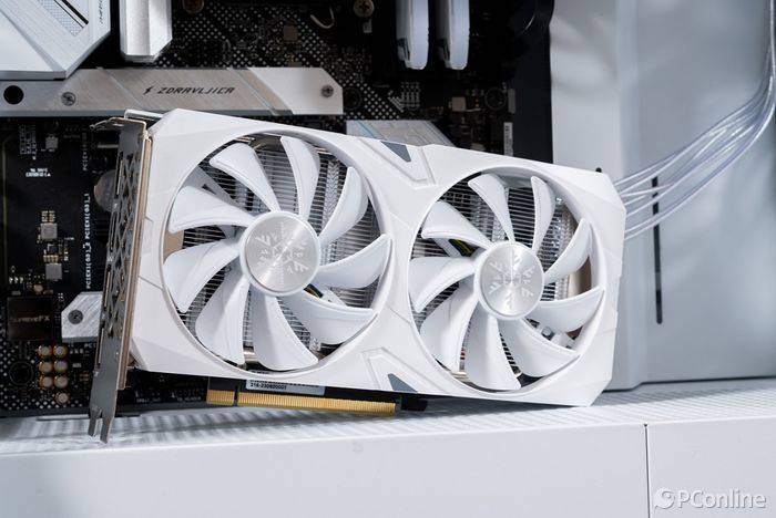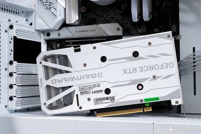 仔细看看这张耕升RTX 4060踏雪,配色绝对是它的一大亮点,珍珠白色不仅符合时下的白色主题海景房装机,观感上还给人以纯净和优雅的感觉,构成了一种既科技又时尚的视觉效果。