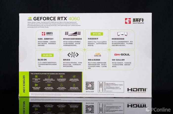 包装背面就比较简洁了,主要介绍了NVIDIA和耕升显卡一些卖点,比如光线追踪技术、DLSS 3深度学习超级采样、耕升自主研发的散热系统、耕升GW-SOUL软件等。