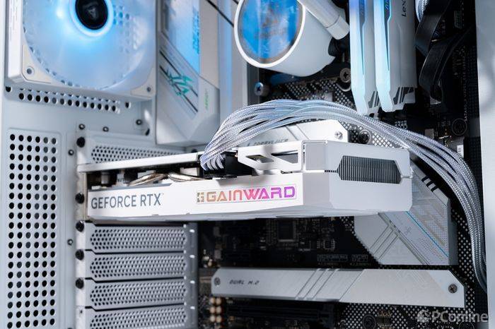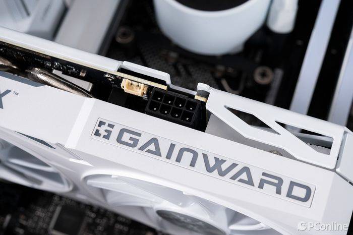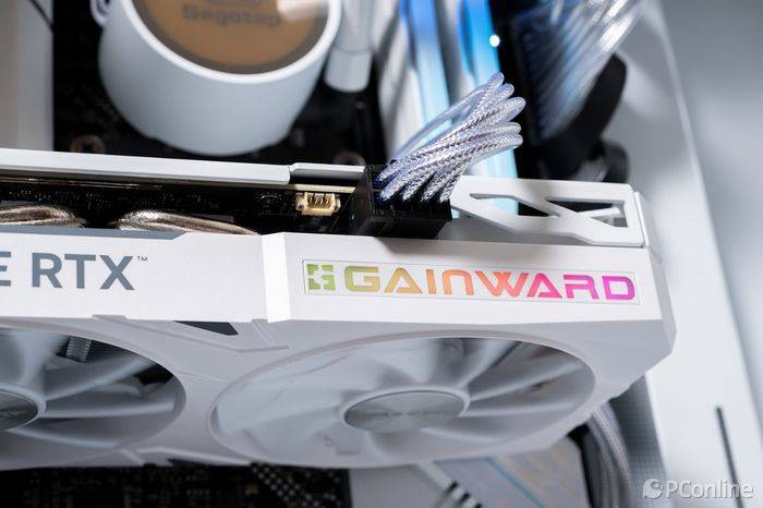 熟悉的"GEFORCE RTX"印刻在显卡顶部, 顶部还有低调而不张扬的RGB效果,通电后,GAINWARD LOGO亮起。当然神光同步肯定是支持的,不过它也可以使用耕升GW-SOUL软件单独调控。