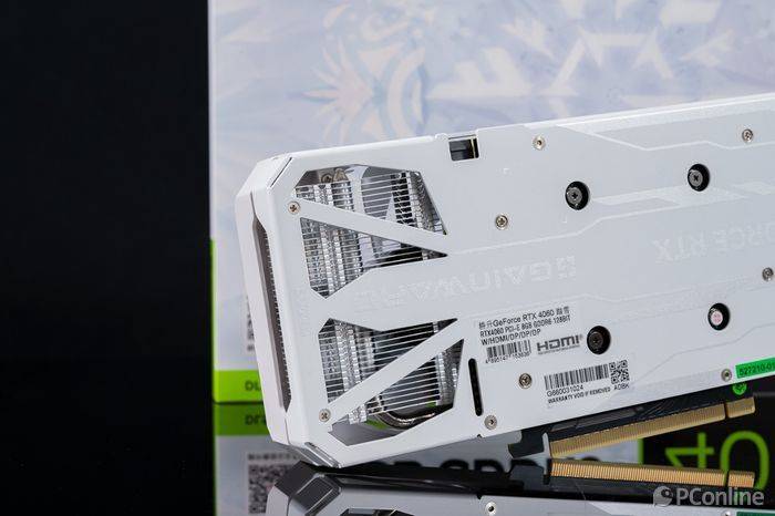 继续欣赏这张显卡,耕升RTX 4060踏雪还是熟悉的味道,背面采用了金属背板,对于显卡PCB可起到加强支撑的作用,并且由于金属良好的导热性,对于散热也有一定的辅助效果。