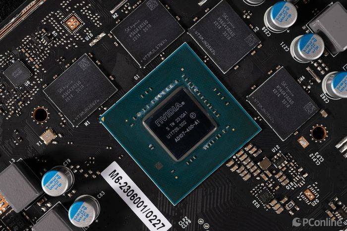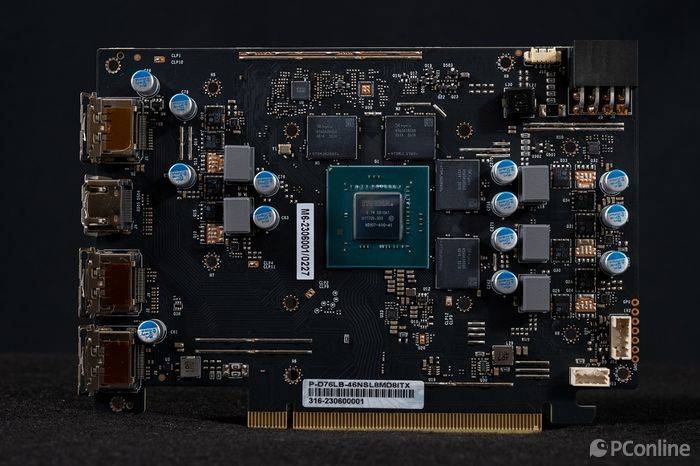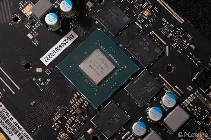 回到正面,我们的主角AD107-400-A1核心安静的镶嵌在正中央。不过它的面积小了许多,但这并不影响它的性能发挥。配置上,其采用全新Ada Lovelace架构和TSMC 4N工艺,还有3072个CUDA以及逆天的24MB L2缓存,可实现高达2 倍的性能功耗比飞跃。