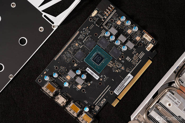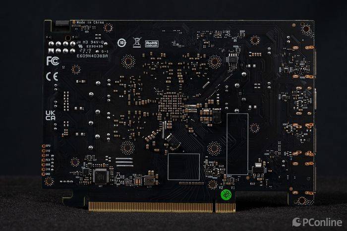 翻到背面来看,这款PCB的精致程度更甚,密密麻麻的MLCC与控制芯片被镶嵌其中,而MLCC是显卡中重要的元器件,用于稳定电源、滤除噪声和电磁干扰,以确保显卡的正常运行,这里就可以看出耕升在显卡设计与制造上的精湛工艺。